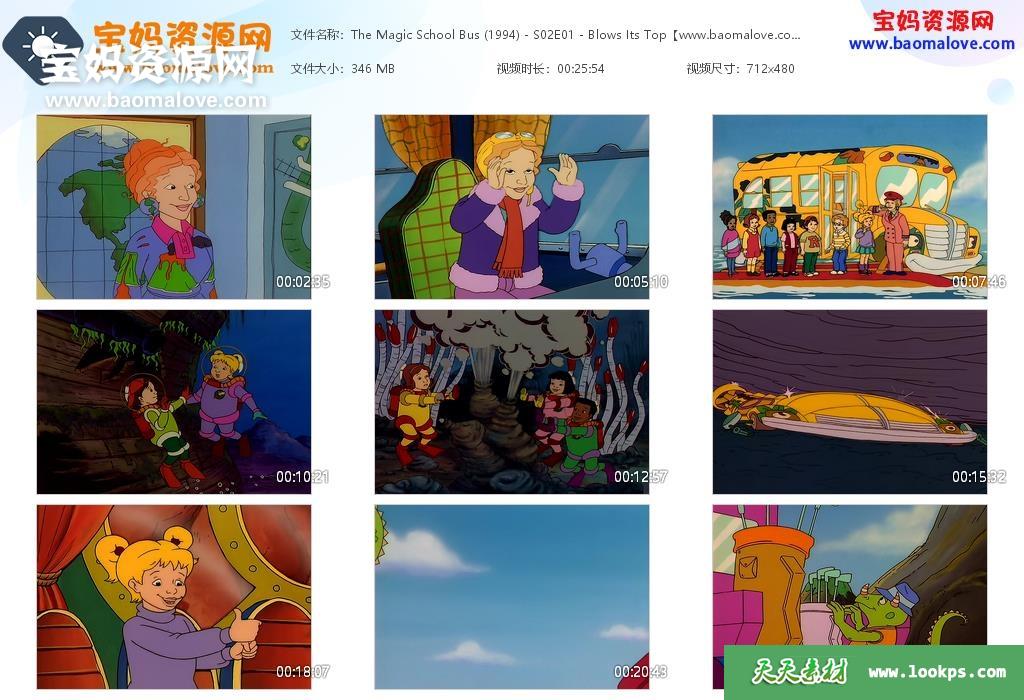 天天资源网收录的动画片《The Magic School Bus》神奇校巴英文版 第二季,全部13集,英语发音,无字幕;每集大小约300M,资源总大小4.58G,单集播放时长约25分钟,480P标清MKV格式,可以在电视机或电脑、平板、IPAD、早教机、手机等各种设备播放,提供百度云网盘下载。