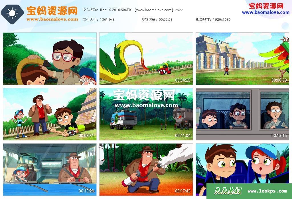 天天资源网收录的动画片《Ben 10》少年骇客英文版 第四季,全部34集,英语发音,内置英文字幕(可以下载后使用播放器选择设置字幕或者关闭字幕);每集大小约680M,资源总大小22.6G,单集播放时长约11分钟,1080P高清MKV格式,可以在电视机或电脑、平板、IPAD、早教机、手机等各种设备播放,提供百度云网盘下载。