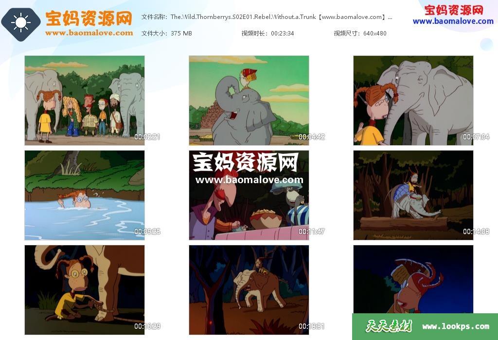 天天资源网收录的动画片《The Wild Thornberrys》丽莎和她的朋友们英文版 第二季,全部37集,英语发音,无字幕;每集大小约370M,资源总大小13.6G,单集播放时长约23分钟,480P标清MKV格式,可以在电视机或电脑、平板、IPAD、早教机、手机等各种设备播放,提供百度云网盘下载。