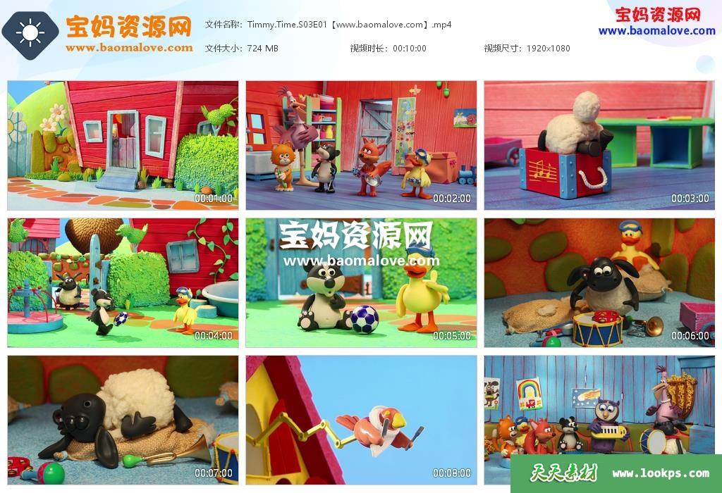 天天资源网收录的动画片《Timmy Time》小小羊蒂米英文版 第三季,全部26集,无对白,无字幕;每集大小约723M,资源总大小18.4G,单集播放时长约10分钟,1080P高清MP4格式,可以在电视机或电脑、平板、IPAD、早教机、手机等各种设备播放,提供百度云网盘下载。