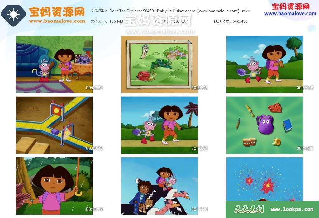 天天资源网收录的动画片《Dora the Explorer》爱探险的朵拉英文版 第四季,全部20集,英语发音,无字幕;每集大小约130M,资源总大小2.59G,单集播放时长约24分钟,480P标清MKV格式,可以在电视机或电脑、平板、IPAD、早教机、手机等各种设备播放,提供百度云网盘下载。