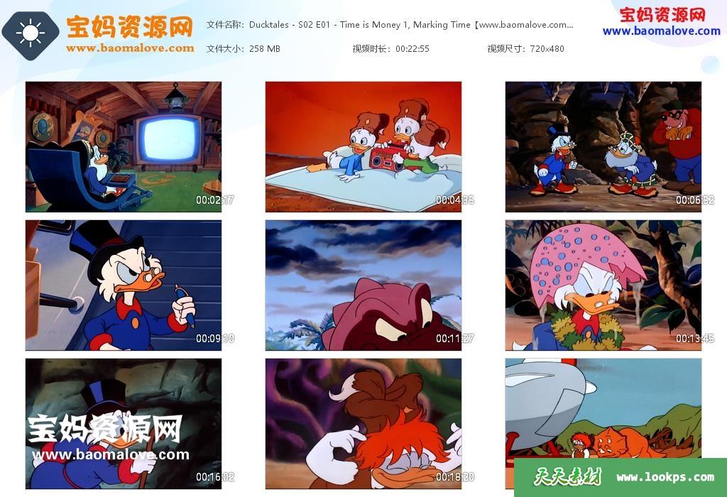 天天资源网收录的动画片《Duck Tales》唐老鸭俱乐部英文版 第二季,全部10集,英语发音,外挂英文字幕(可下载后使用播放器选择设置字幕或者关闭字幕);每集大小约270M,资源总大小2.69G,单集播放时长约23分钟,480P标清MP4格式,可以在电视机或电脑、平板、IPAD、早教机、手机等各种设备播放,提供百度云网盘下载。