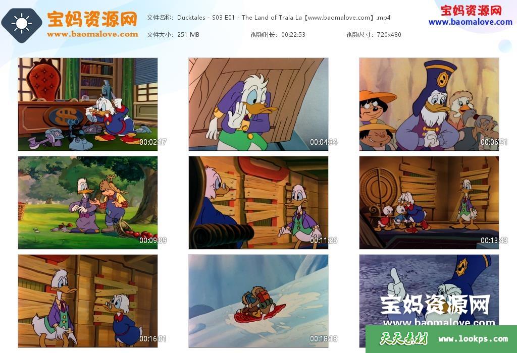 天天资源网收录的动画片《Duck Tales》唐老鸭俱乐部英文版 第三季,全部18集,英语发音,外挂英文字幕(可下载后使用播放器选择设置字幕或者关闭字幕);每集大小约270M,资源总大小4.53G,单集播放时长约23分钟,480P标清MP4格式,可以在电视机或电脑、平板、IPAD、早教机、手机等各种设备播放,提供百度云网盘下载。