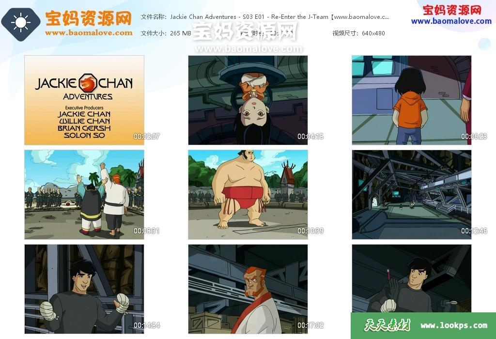 天天资源网收录的动画片《Jackie Chan Adventures》成龙历险记英文版 第三季,全部17集,英语发音,外挂英文字幕(可下载后使用播放器选择设置字幕或者关闭字幕);每集大小约260M,资源总大小4.27G,单集播放时长约22分钟,480P标清MP4格式,可以在电视机或电脑、平板、IPAD、早教机、手机等各种设备播放,提供百度云网盘下载。