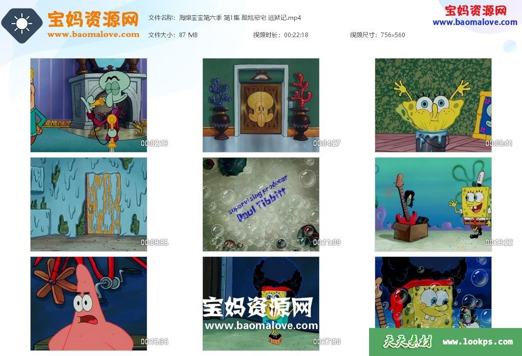 天天资源网收录的《海绵宝宝》SpongeBob SquarePants中文版 第六季,全部26集,国语发音,无字幕;每集大小约100M,总大小2.68G,单集播放时长约23分钟,560P标清MP4格式,可以在电视机或电脑、平板、IPAD、早教机、手机等各种设备播放,提供百度云网盘下载。