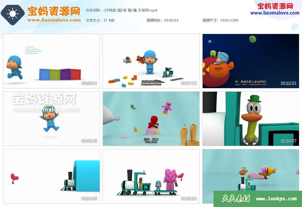 天天资源网收录的动画片《小P优优》POCOYO中文版 第五季,全部35集,国语发音,中英文字幕;每集大小约40M,资源总大小1.35G,单集播放时长约7分钟,1080P高清MP4格式,可以在电视机或电脑、平板、IPAD、早教机、手机等各种设备播放,提供百度云网盘下载。