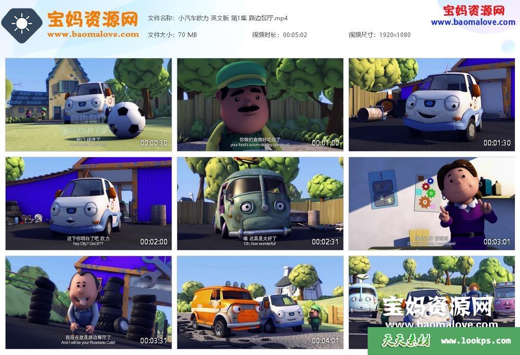 天天资源网收录的动画片《Olly the Little White Van》小汽车欧力英文版,全部65集,英语发音,中英文字幕;每集大小约60M,资源总大小3.46G,单集播放时长约5分钟,1080P高清MP4格式,可以在电视机或电脑、平板、IPAD、早教机、手机等各种设备播放,提供百度云网盘下载。