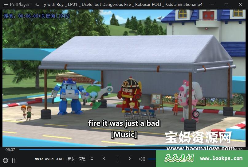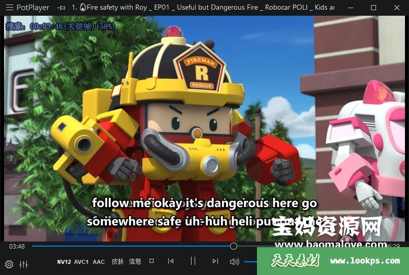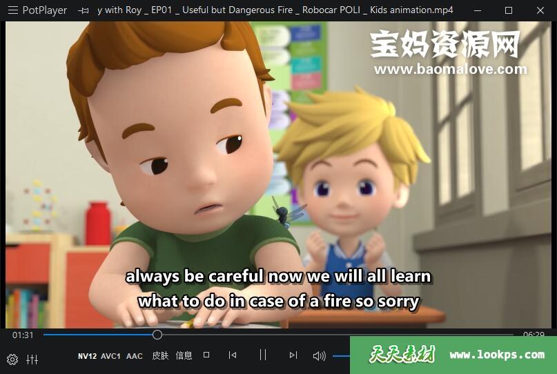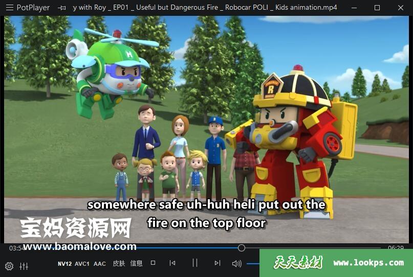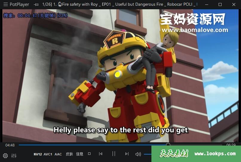 天天资源网收录的动画片《Fire Safety with ROY》变形警车珀利之消防安全篇英文版,全部26集,英语发音,外挂英文字幕(可下载后使用播放器选择设置字幕或者关闭字幕);每集大小约85M,资源总大小1.98G,单集播放时长约7分钟,1080P高清MP4格式,可以在电视机或电脑、平板、IPAD、早教机、手机等各种设备播放,提供百度云网盘下载。