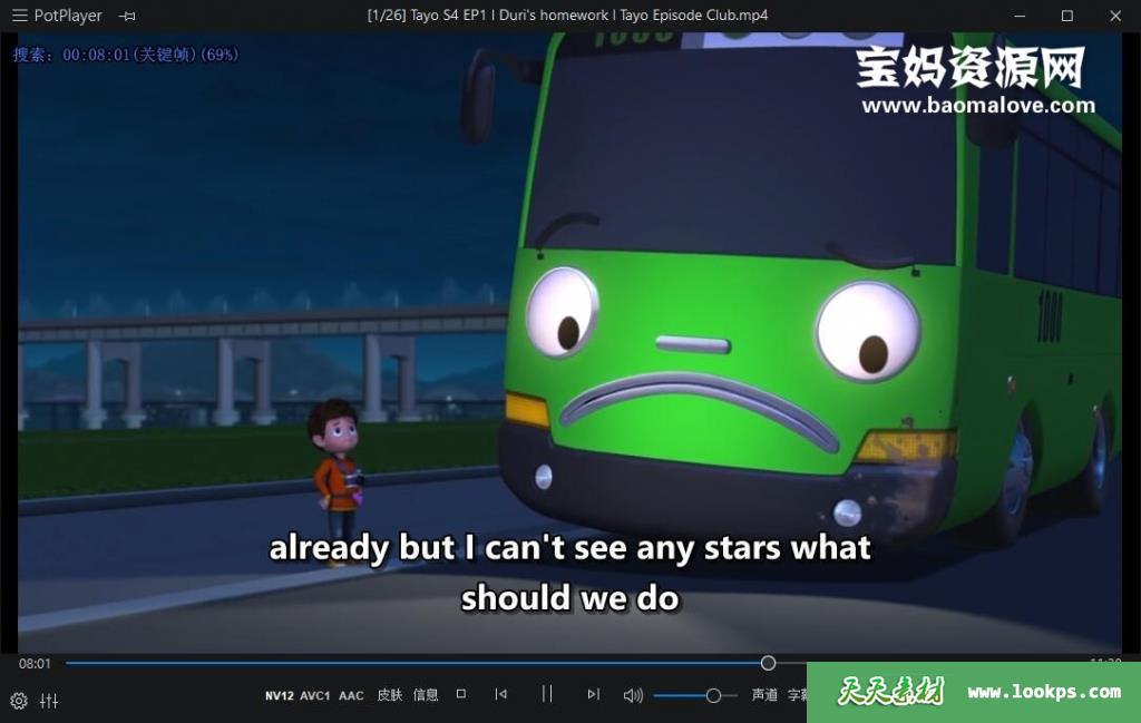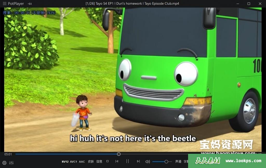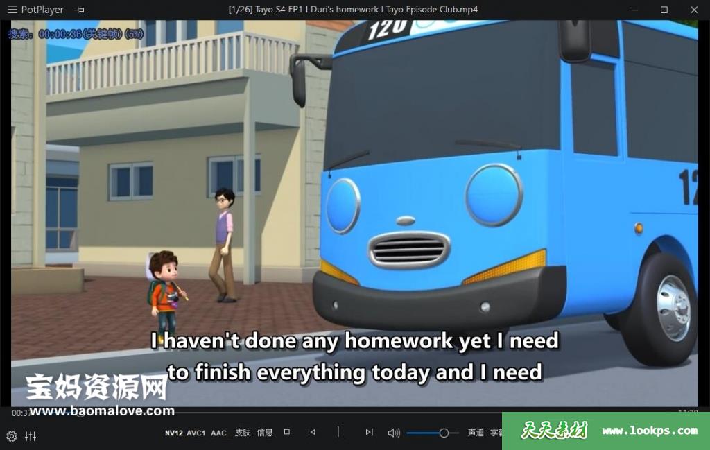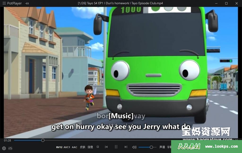 天天资源网收录的动画片《Tayo the little bus》小公交车太友英文版 第四季,全部26集,英语发音,外挂英文字幕(可下载后使用播放器选择设置字幕或者关闭字幕);每集大小约115M,资源总大小3.02G,单集播放时长约11分钟,1080P高清MP4格式,可以在电视机或电脑、平板、IPAD、早教机、手机等各种设备播放,提供百度云网盘下载。