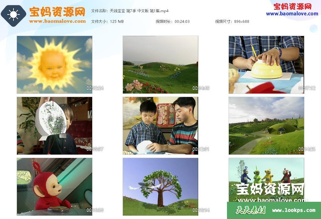 天天资源网收录的《天线宝宝》Teletubbies中文版 第七季,全部26集,国语发音,无字幕;每集大小约110M,总大小3.01G,单集播放时长约24分钟,504P标清MP4格式,可以在电视机或电脑、平板、IPAD、早教机、手机等各种设备播放,提供百度云网盘下载。