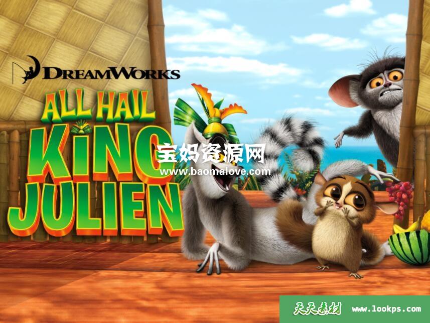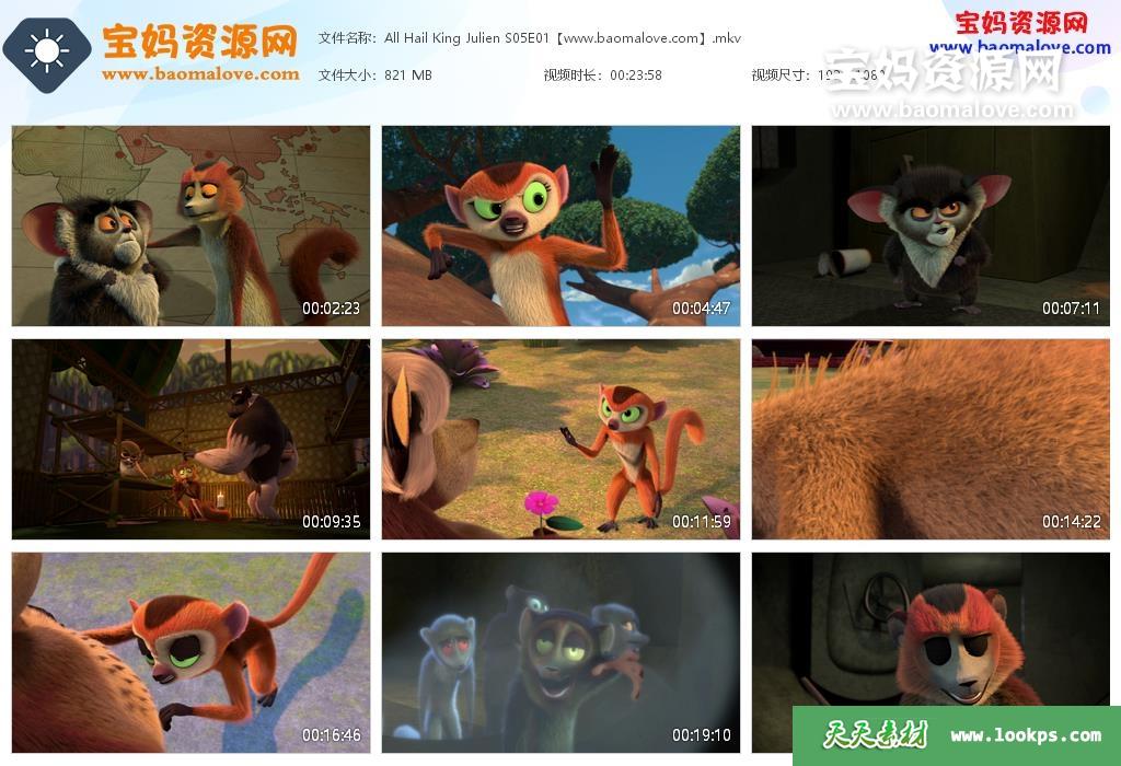 天天资源网收录的动画片《All Hail King Julien》朱利安国王万岁英文版 第五季,全部13集,英语发音,内置英文字幕(内置多国语言字幕,西班牙文,葡萄牙文,德文,瑞典文,德文,芬兰文,保加利亚文等,可以下载后使用播放器选择字幕或者关闭字幕);每集大小900M,总大小12.3G,单集播放时长约24分钟,1080P高清MKV格式,可以在电视机或电脑、平板、IPAD、早教机、手机等各种设备播放,提供百度云网盘下载。