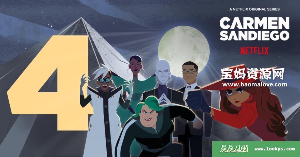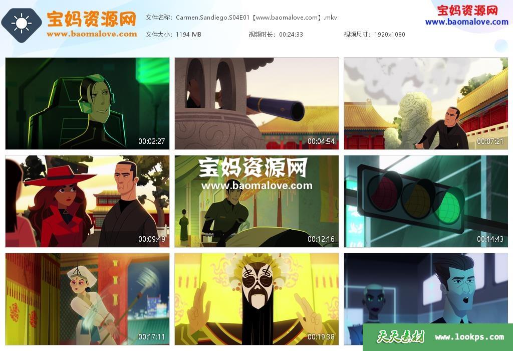 天天资源网收录的动画片《Carmen Sandiego》大神偷卡门英文版 第四季,全部8集,英语发音,内置英文字幕(内置多国语言字幕,如简体中文,繁体中文,泰文,意大利文,西班牙文,法文,瑞典文,日文,德文,越南文等,可以下载后使用播放器设置字幕字体大小颜色或者关闭字幕);每集大小约1100M,资源总大小7.97G,单集播放时长约24分钟,1080P高清MKV格式,可以在电视机或电脑、平板、IPAD、早教机、手机等各种设备播放,提供百度网盘下载。