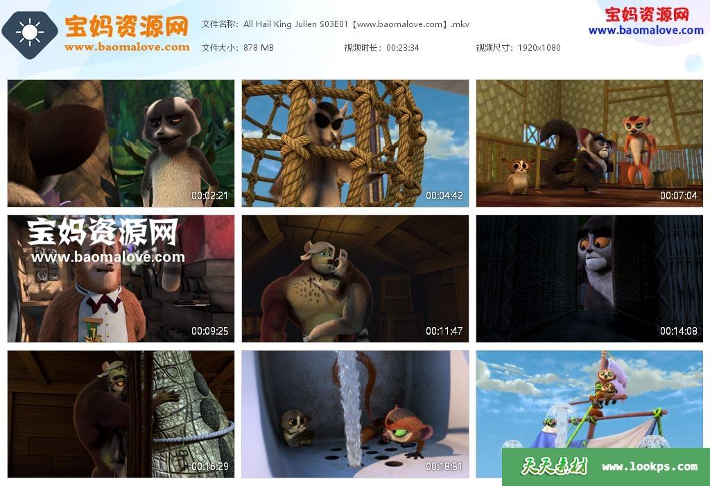 天天资源网收录的动画片《All Hail King Julien》朱利安国王万岁英文版 第三季,全部13集,英语发音,内置英文字幕(内置多国语言字幕,中文,荷兰文,日文,意大利文,波兰文,葡萄牙文,韩文,瑞典文,芬兰文,法文,阿拉伯文,挪威文,保加利亚文,丹麦文,德文,土耳其文,西班牙文等,可以下载后使用播放器选择字幕或者关闭字幕);每集大小880M,总大小11.9G,单集播放时长约23分钟,1080P高清MKV格式,可以在电视机或电脑、平板、IPAD、早教机、手机等各种设备播放,提供百度云网盘下载。