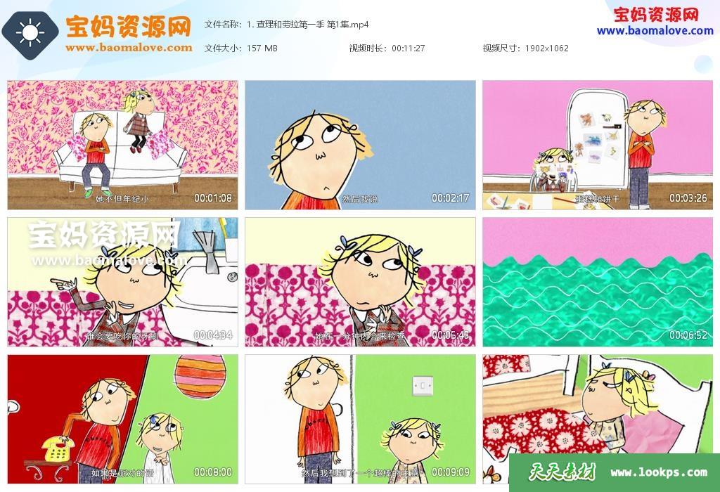 天天资源网收录的动画片《查理和劳拉》Charlie And Lola中文版 第一季,全部26集,国语发音,中文字幕;每集大小约160M,资源总大小3.93G,单集播放时长约11分钟,1080P高清MP4格式,可以在电视机或电脑、平板、IPAD、早教机、手机等各种设备播放,提供百度云网盘下载。