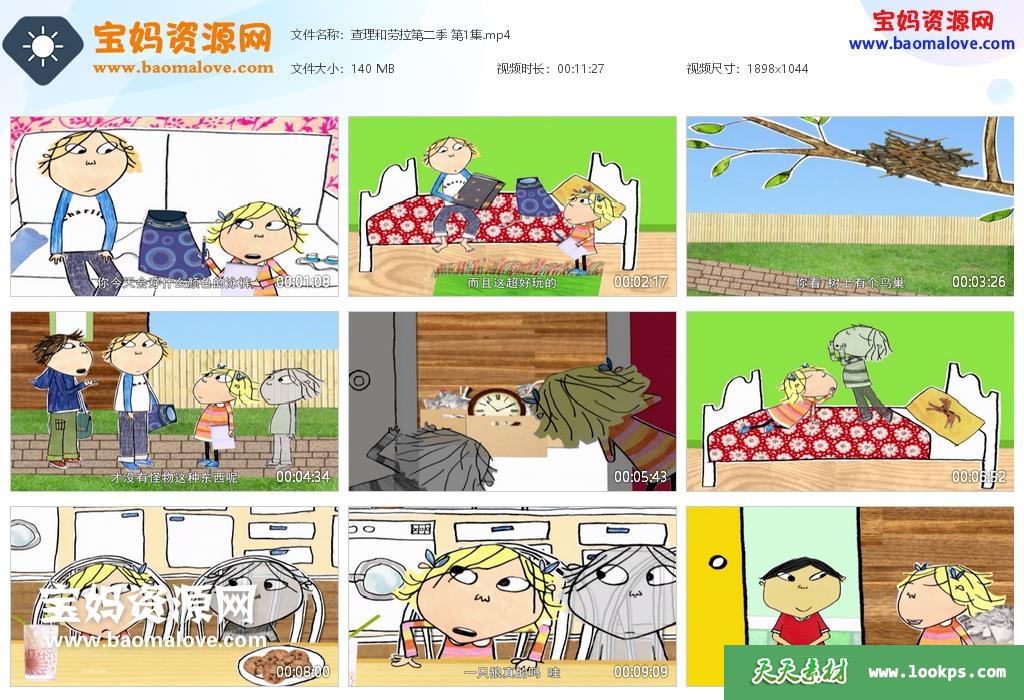 天天资源网收录的动画片《查理和劳拉》Charlie And Lola中文版 第二季,全部26集,国语发音,中文字幕;每集大小约140M,资源总大小3.58G,单集播放时长约11分钟,1080P高清MP4格式,可以在电视机或电脑、平板、IPAD、早教机、手机等各种设备播放,提供百度云网盘下载。