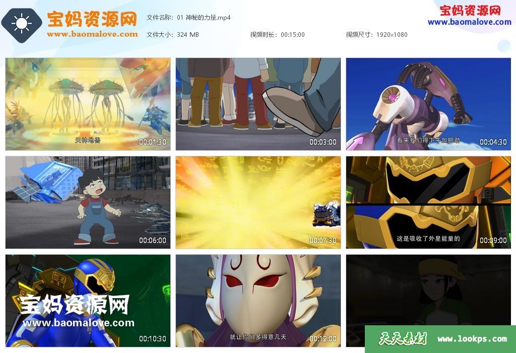 天天资源网收录的动画片《神兽金刚之天神地兽》,全部52集,国语发音,中文字幕;每集大小约100M,资源总大小8G,单集播放时长约15分钟,720P高清MP4格式,可以在电视机或电脑、平板、IPAD、早教机、手机等各种设备播放,提供百度网盘下载。