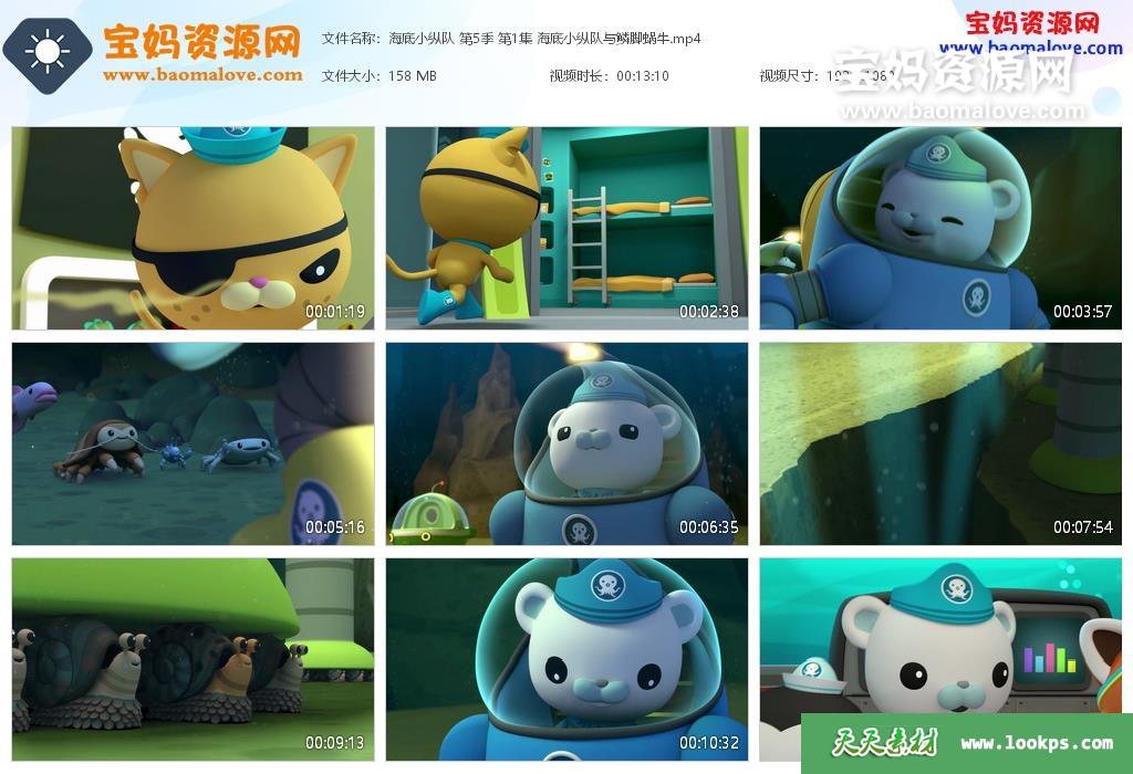 天天资源网收录的动画片《海底小纵队》The Octonauts中文版 第五季,全部27集,国语发音,无字幕;每集大小约90M,总大小2.87G,单集播放时长约13分钟,1080P高清MP4格式,可以在电视机或电脑、平板、IPAD、早教机、手机等各种设备播放,提供百度云网盘下载。