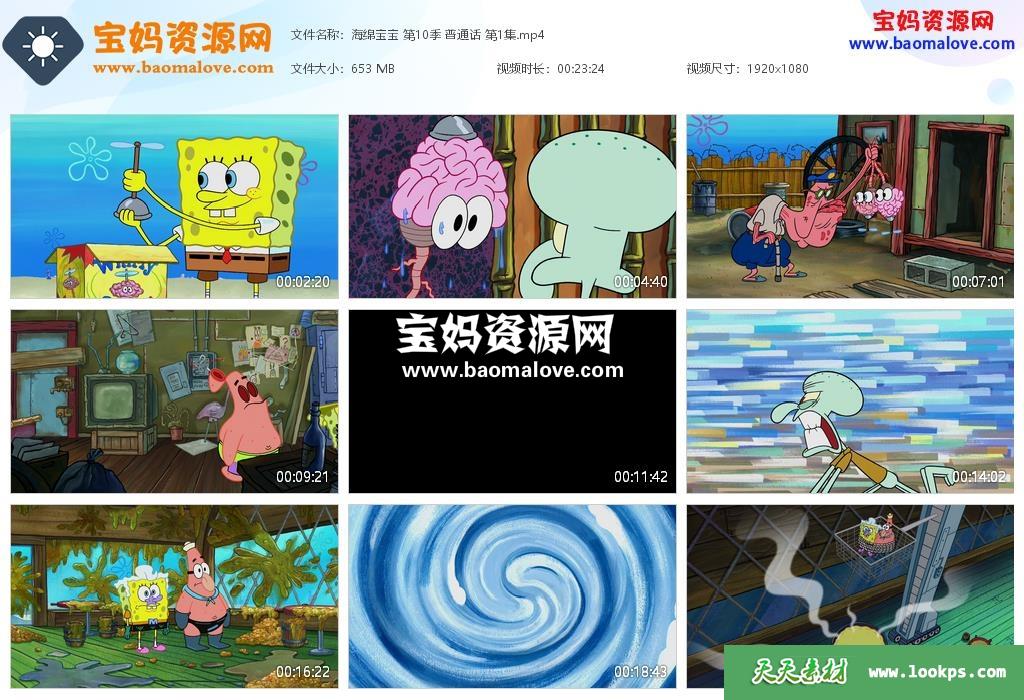天天资源网收录的《海绵宝宝》SpongeBob SquarePants中文版 第十季,全部11集,国语发音,无字幕;每集大小约660M,资源总大小6.95G,单集播放时长约23分钟,1080P高清MP4格式,可以在电视机或电脑、平板、IPAD、早教机、手机等各种设备播放,提供百度云网盘下载。