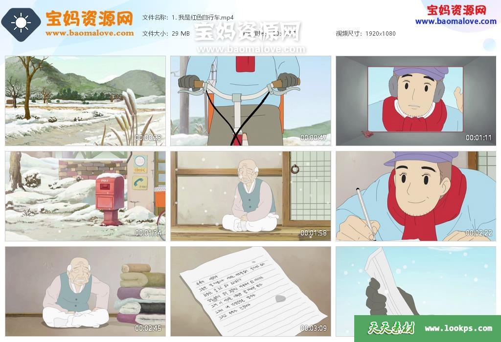 天天资源网收录的动画片《红色自行车》Red Bicycle中文版,全部304集,国语发音,无字幕;每集大小约30M,资源总大小8.8G,单集播放时长约4分钟,1080P高清MP4格式,可以在电视机或电脑、平板、IPAD、早教机、手机等各种设备播放,提供百度云网盘下载。