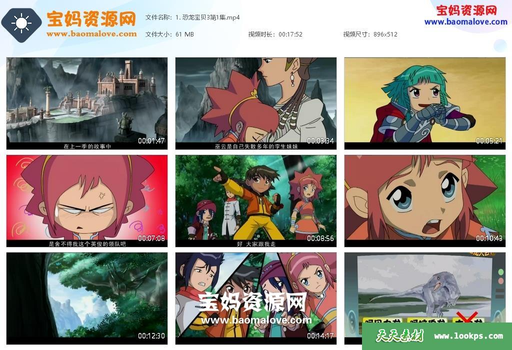 天天资源网收录的动画片《恐龙宝贝之龙神勇士》第三季 ,全部52集,国语发音,中文字幕;每集大小约50M,总大小3.13G,单集播放时长约17分钟,480P标清MP4格式,可以在电视机或电脑、平板、IPAD、早教机、手机等各种设备播放,提供百度云网盘下载。