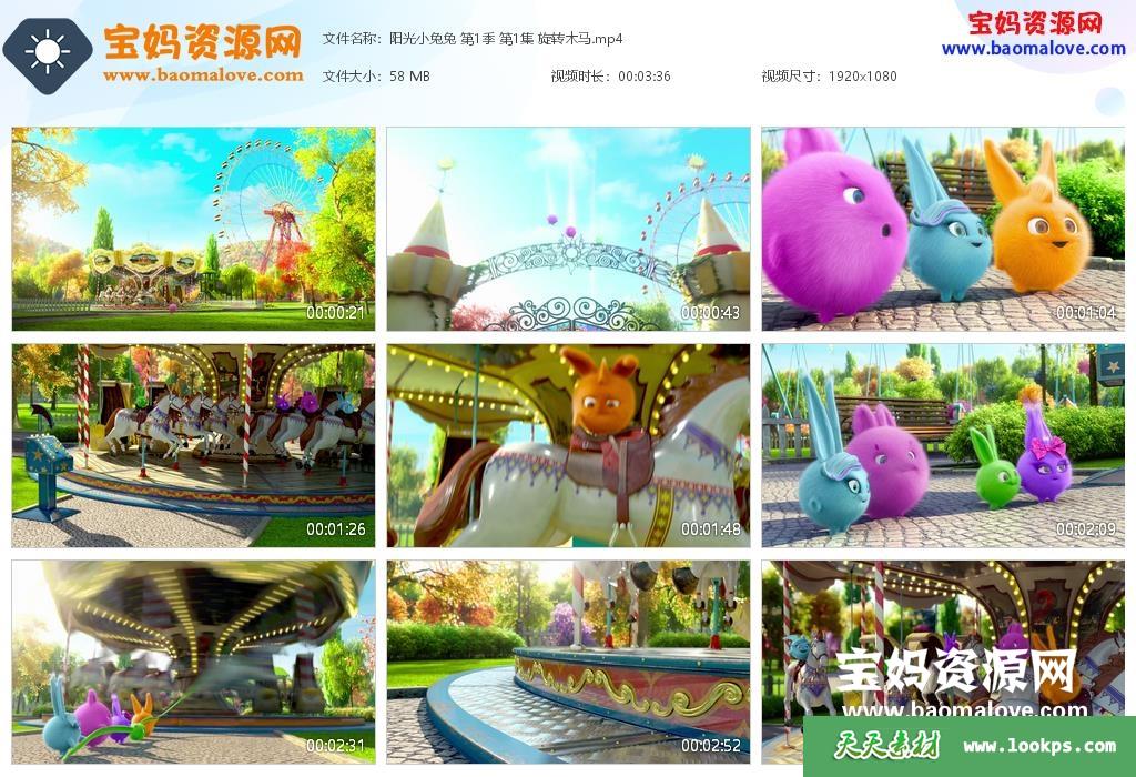 天天资源网收录的动画片《阳光小兔兔》Sunny Bunnies 第一季,全部26集,无对白,默片动画;每集大小约50M,资源总大小1.31G,单集播放时长约3分钟,1080P高清MP4格式,可以在电视机或电脑、平板、IPAD、早教机、手机等各种设备播放,提供百度云网盘下载。