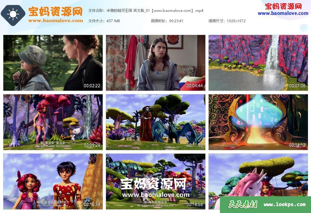 天天资源网收录的动画片《Mia and Me》米雅的精灵王国英文版,全部78集,英语发音,中英文字幕;每集大小约465M,总大小34.4G,单集播放时长约23分钟,1080P高清MP4格式,可以在电视机或电脑、平板、IPAD、早教机、手机等各种设备播放,提供百度云网盘下载。