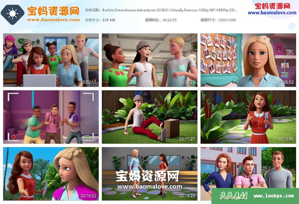 天天资源网收录的动画片《 Barbie Dreamhouse Adventures》芭比梦幻屋冒险旅程英文版 第三季,全集9集,英语发音,内置英文字幕(可以下载后使用播放器选择设置字幕或者关闭字幕);每集大小约760M,资源总大小6.92G,单集播放时长约22分钟,1080P高清MKV格式,可以在电视机或电脑、平板、IPAD、早教机、手机等各种设备播放,提供百度云网盘下载。
