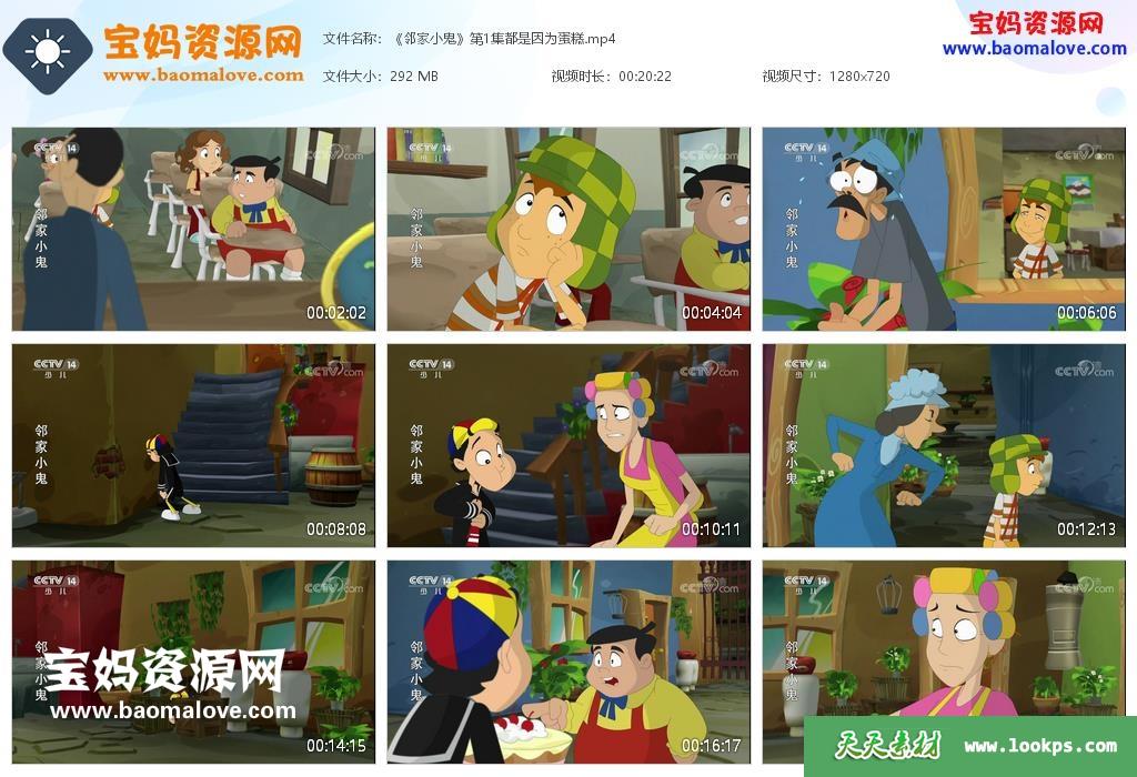 天天资源网收录的动画片《邻家小鬼》El Chavo中文版,全部52集,国语发音,无字幕;每集大小约300M,资源总大小15.4G,单集播放时长约21分钟,720P高清MP4格式,可以在电视机或电脑、平板、IPAD、早教机、手机等各种设备播放,提供百度云网盘下载。