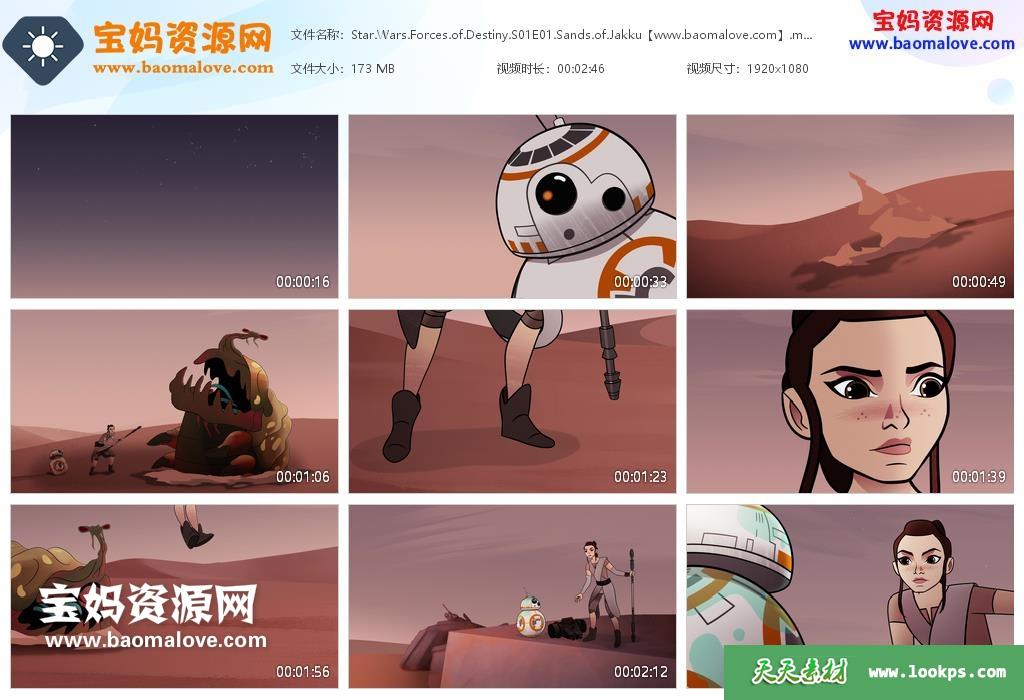 天天资源网收录的动画片《Star Wars: Forces of Destiny》星球大战:命运的力量英文版 第一季,全部16集,英语发音,内置英文字幕(可以下载后使用播放器选择设置字幕或者关闭字幕);每集大小170M,资源总大小2.62G,单集播放时长约3分钟,1080P高清MKV格式,可以在电视机或电脑、平板、IPAD、早教机、手机等各种设备播放,提供百度云网盘下载。