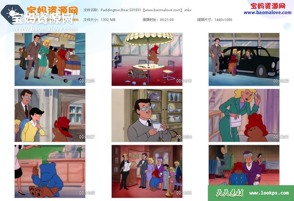 天天资源网收录的动画片《Paddington Bear》帕丁顿熊英文版 第一季,全部13集,英语发音,内置英文字幕(可以下载后使用播放器选择设置字幕或者关闭字幕);每集大小1600M,资源总大小16.6G,单集播放时长约21分钟,1080P高清MKV格式,可以在电视机或电脑、平板、IPAD、早教机、手机等各种设备播放,提供百度云网盘下载。