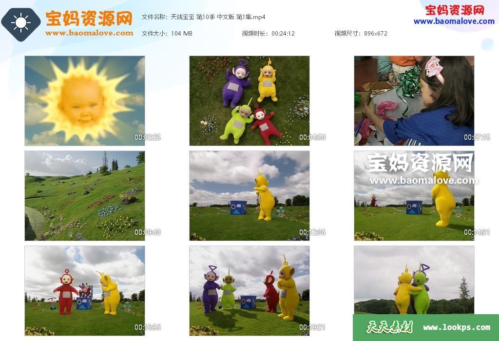 天天资源网收录的动画片《天线宝宝》Teletubbies中文版 第十季,全部26集,国语发音,无字幕;每集大小约105M,资源总大小2.74G,单集播放时长约24分钟,656P标清MP4格式,可以在电视机或电脑、平板、IPAD、早教机、手机等各种设备播放,提供百度云网盘下载。