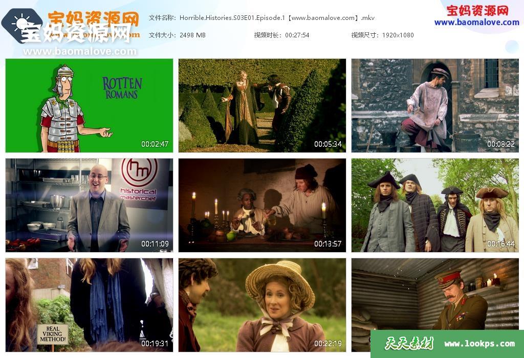 天天资源网收录的动画片《Horrible Histories》糟糕历史英文版 第三季,全部13集,英语发音,内置英文字幕(可以下载后使用播放器选择设置字幕或者关闭字幕);每集大小2500M,资源总大小31.4G,单集播放时长约28分钟,1080P高清MKV格式,可以在电视机或电脑、平板、IPAD、早教机、手机等各种设备播放,提供百度云网盘下载。