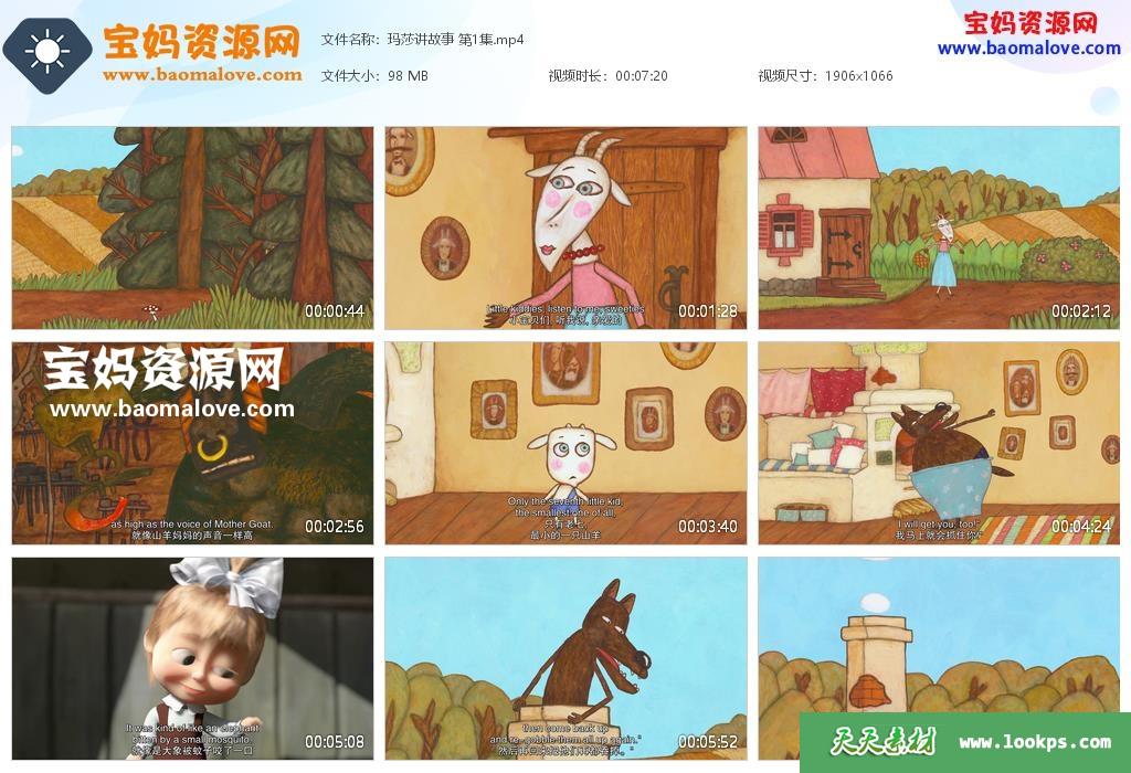 天天资源网收录的动画片《Masha’s Tales》玛莎的故事英文版,全部5集,英语发音,中英文字幕;每集大小约100M,资源总大小2G,单集播放时长约5分钟,1080P高清MP4格式,可以在电视机或电脑、平板、IPAD、早教机、手机等各种设备播放,提供百度云网盘下载。