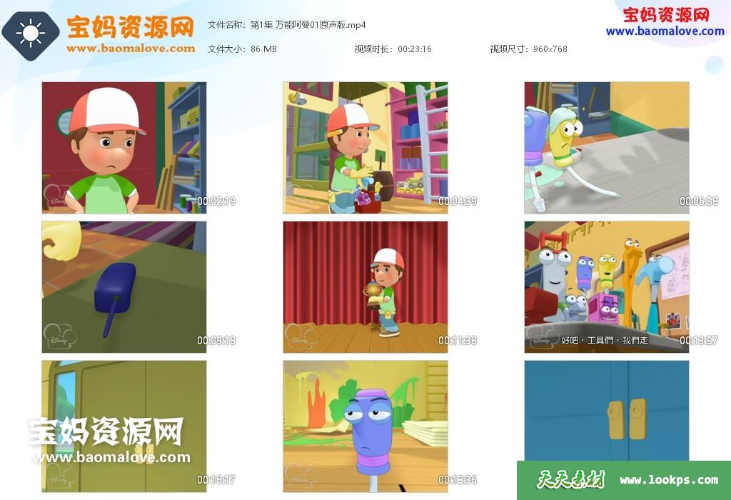 天天资源网收录的动画片《Handy Manny》万能阿曼英文版 第一季,全部26集,英语发音,中文字幕;每集大小约88M,资源总大小2.16G,单集播放时长约23分钟,768P高清MP4格式,可以在电视机或电脑、平板、IPAD、早教机、手机等各种设备播放,提供百度云网盘下载。