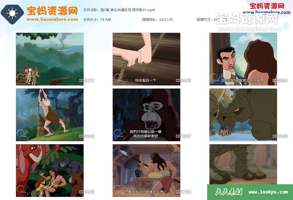 天天资源网收录的动画片《The Legend of Tarzan》泰山卡通系列英文版,全部39集,英语发音,中英文字幕;每集大小约75M,资源总大小2.89G,单集播放时长约22分钟,752P高清MP4格式,可以在电视机或电脑、平板、IPAD、早教机、手机等各种设备播放,提供百度云网盘下载。
