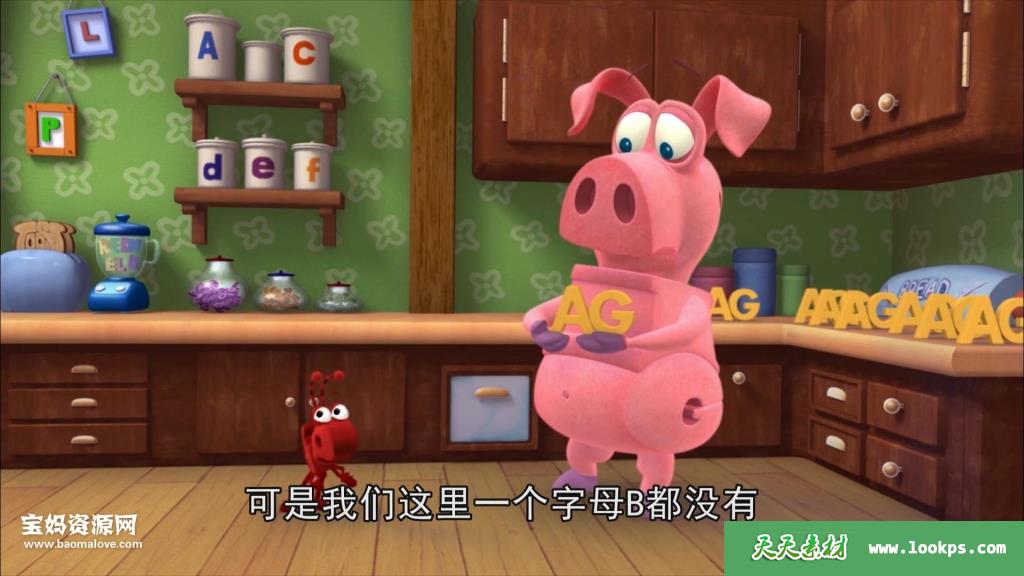 这部动画最大的特点,就是故事中的每件物品都是由英语单词拼成的。而故事的主角是5只可爱的小动物,Sheep羊,Bear熊,Dog狗,Duck鸭子,Ant蚂蚁,不仅可爱的动物主角是由字母组成,就连动画场景也到处充斥着字母装饰,为的就是在视觉上及听觉上,给小朋友充分营造英语环境。
