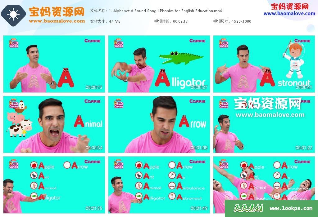 天天资源网收录的动画片《Alphabet A to Z Sound Song Phonics for English Education》英文字母 A-Z英文版,全部26集,英语发音,无字幕;每集大小约50M,资源总大小1.3G,单集播放时长约2分钟,1080P高清MP4格式,可以在电视机或电脑、平板、IPAD、早教机、手机等各种设备播放,提供百度云网盘下载。