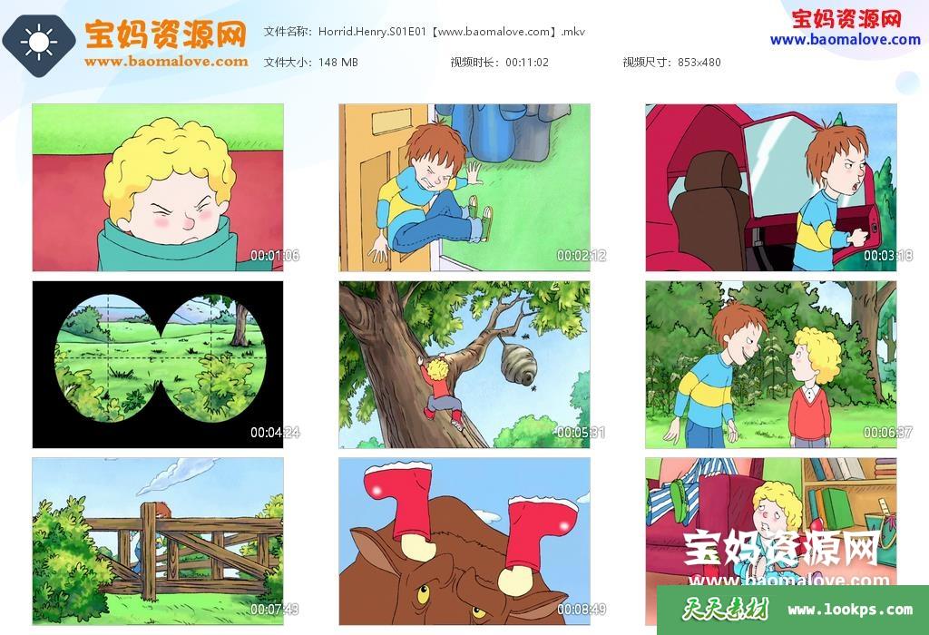 天天资源网收录的动画片《Horrid Henry》调皮的亨利英文版 第一季,全部52集,英语发音,内置英文字幕(可以下载后使用播放器选择设置字幕或者关闭字幕);每集大小约150M,资源总大小7.19G,单集播放时长约11分钟,480P标清MKV格式,可以在电视机或电脑、平板、IPAD、早教机、手机等各种设备播放,提供百度云网盘下载。