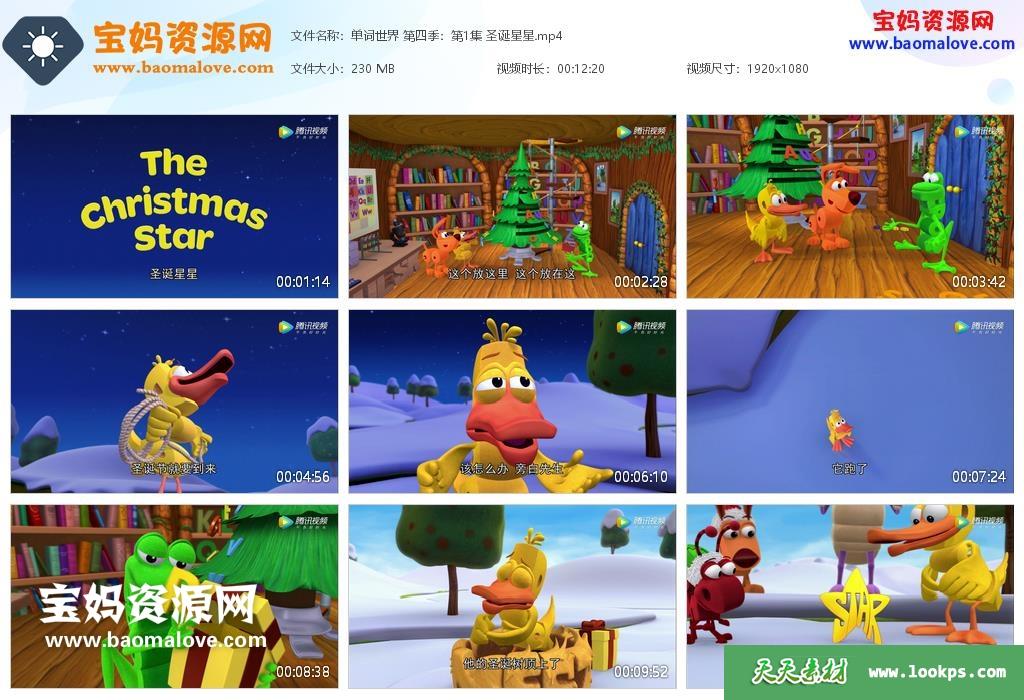 天天资源网收录的动画片《单词世界》Word World中文版 第四季,全部12集,国语发音,中文字幕;每集大小约230M,资源总大小2.7G,单集播放时长约12分钟,1080P高清MP4格式,可以在电视机或电脑、平板、IPAD、早教机、手机等各种设备播放,提供百度云网盘下载。