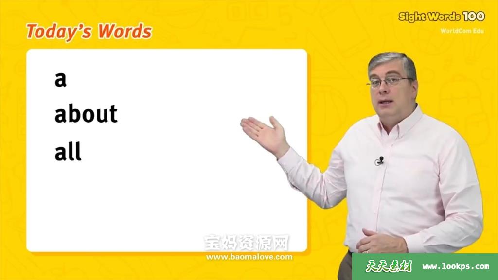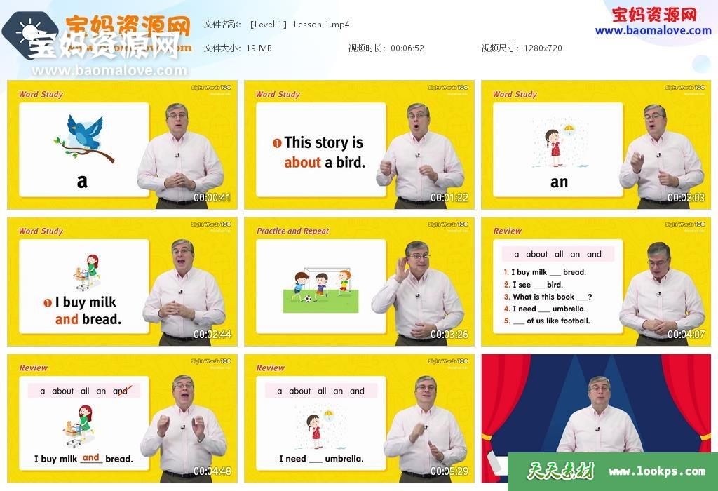 天天资源网收录的动画片《【Level 1-6全】高频词 Sight Words 100 》跟Brian老师学英语,全部120集,英语发音,无字幕;每集大小约20M,资源总大小2.86G,单集播放时长约6分钟,720P高清MP4格式,可以在电视机或电脑、平板、IPAD、早教机、手机等各种设备播放,提供百度云网盘下载。