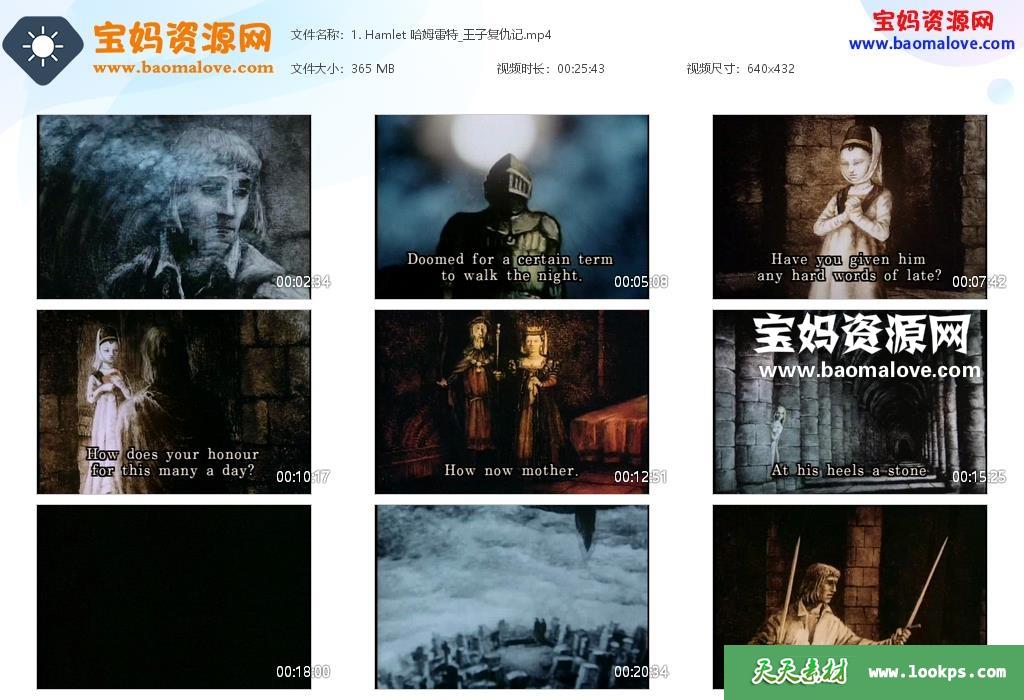 天天资源网收录的动画片《Shakespeare: The Animated Tales》莎士比亚名剧动画英文版,全部12集,英语发音,英语字幕;每集大小约330M,资源总大小3.84G,单集播放时长约26分钟,432P标清MP4格式,可以在电视机或电脑、平板、IPAD、早教机、手机等各种设备播放,提供百度云网盘下载。