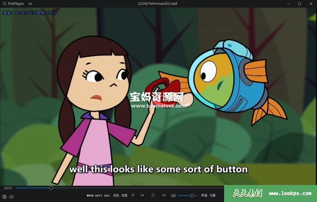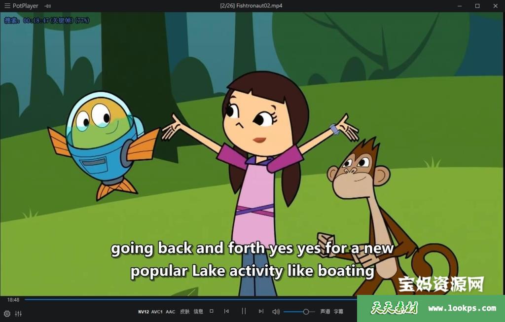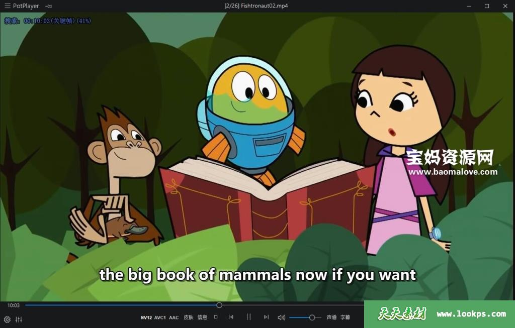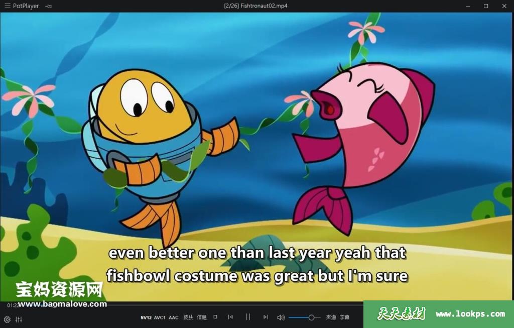 天天资源网收录的动画片《Fishtronaut》费雪小鱼侦探队英文版 第一季,全部52集,英语发音,外挂英文字幕(其中有几集无字幕)(可以下载后使用播放器选择设置字幕或者关闭字幕);每集大小95M,资源总大小5.94G,单集播放时长约12分钟,720P高清MP4格式,可以在电视机或电脑、平板、IPAD、早教机、手机等各种设备播放,提供百度云网盘下载。