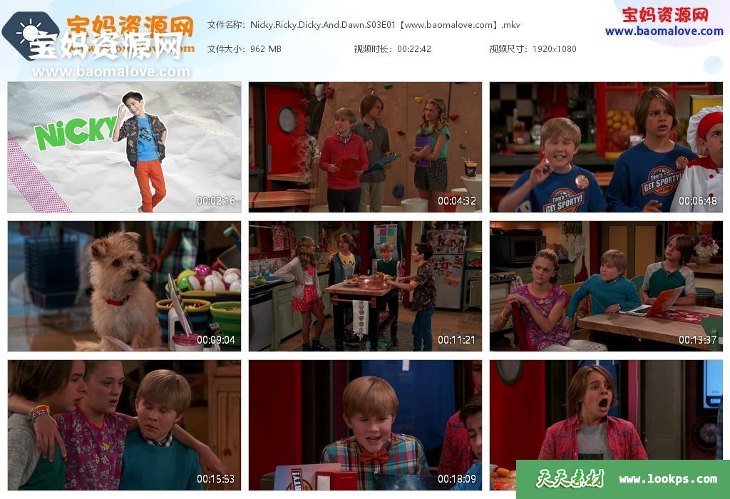 天天资源网收录的动画片《Nicky, Ricky, Dicky & Dawn》家有四宝英文版 第三季,全部24集,英语发音,内置英文字幕(可以下载后使用播放器选择设置字幕或者关闭字幕);每集大小950M,资源总大小23.2G,单集播放时长约22分钟,1080P高清MKV格式,可以在电视机或电脑、平板、IPAD、早教机、手机等各种设备播放,提供百度云网盘下载。