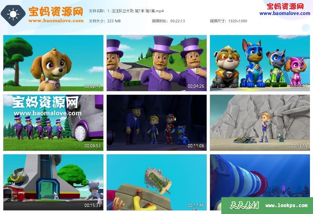 天天资源网收录的动画片《汪汪队立大功》PAW Patrol中文版 第七季,全部25集,国语发音,无字幕;每集大小约220M,资源总大小5.22G,单集播放时长约22分钟,1080P高清MP4格式,可以在电视机或电脑、平板、IPAD、早教机、手机等各种设备播放,提供百度云网盘下载。