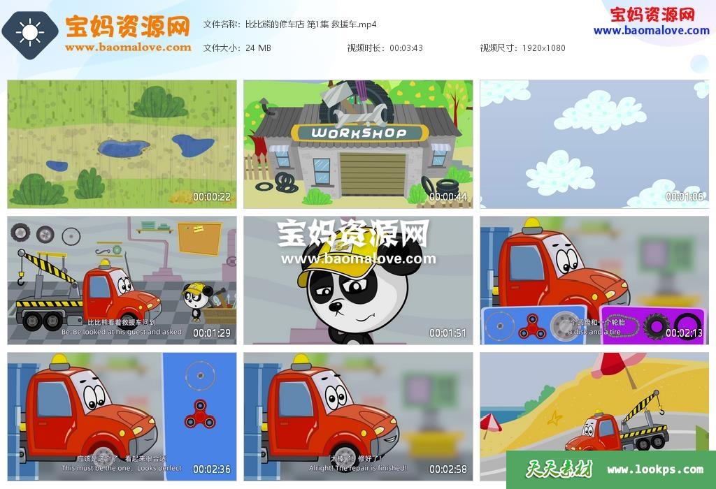天天资源网收录的动画片《比比熊的修车店》,全部46集,英语发音,中英文字幕;每集大小约30M,资源总大小1.85G,单集播放时长约4分钟,1080P高清MP4格式,可以在电视机或电脑、平板、IPAD、早教机、手机等各种设备播放,提供百度云网盘下载。
