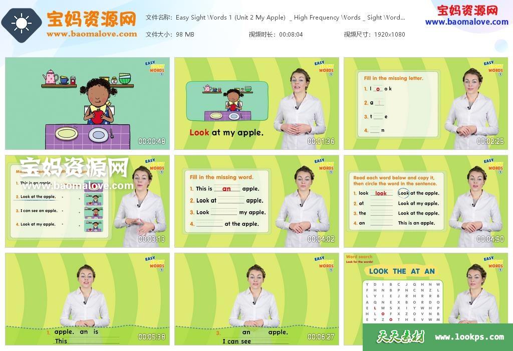 天天资源网收录的动画片《Easy Sight Words》高频词外教精讲视频第一季,全部17集,英语发音,内置英文字幕(可以下载后使用播放器选择设置字幕或者关闭字幕);每集大小60M,资源总大小1.13G,单集播放时长约8分钟,1080P高清MKV格式,可以在电视机或电脑、平板、IPAD、早教机、手机等各种设备播放,提供百度云网盘下载。