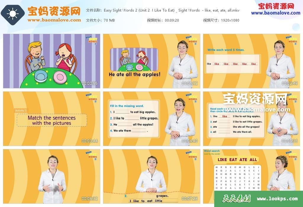 天天资源网收录的动画片《Easy Sight Words》高频词外教精讲视频第二季,全部17集,英语发音,内置英文字幕(可以下载后使用播放器选择设置字幕或者关闭字幕);每集大小60M,资源总大小1.14G,单集播放时长约8分钟,1080P高清MKV格式,可以在电视机或电脑、平板、IPAD、早教机、手机等各种设备播放,提供百度云网盘下载。
