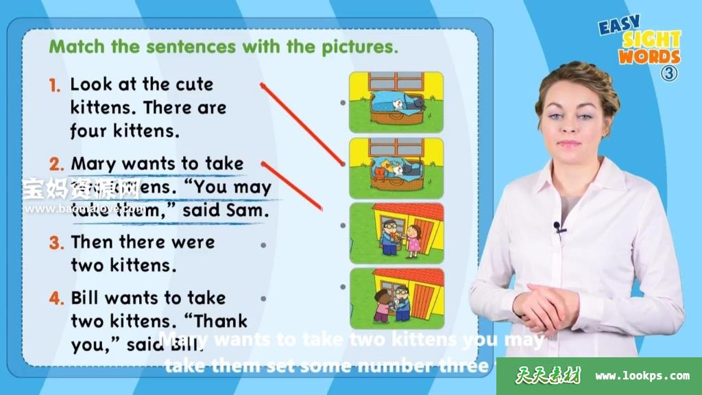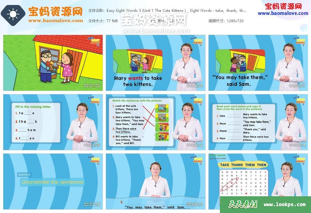 天天资源网收录的动画片《Easy Sight Words》高频词外教精讲视频第三季,全部17集,英语发音,内置英文字幕(可以下载后使用播放器选择设置字幕或者关闭字幕);每集大小60M,资源总大小1.18G,单集播放时长约8分钟,1080P高清MKV格式,可以在电视机或电脑、平板、IPAD、早教机、手机等各种设备播放,提供百度云网盘下载。