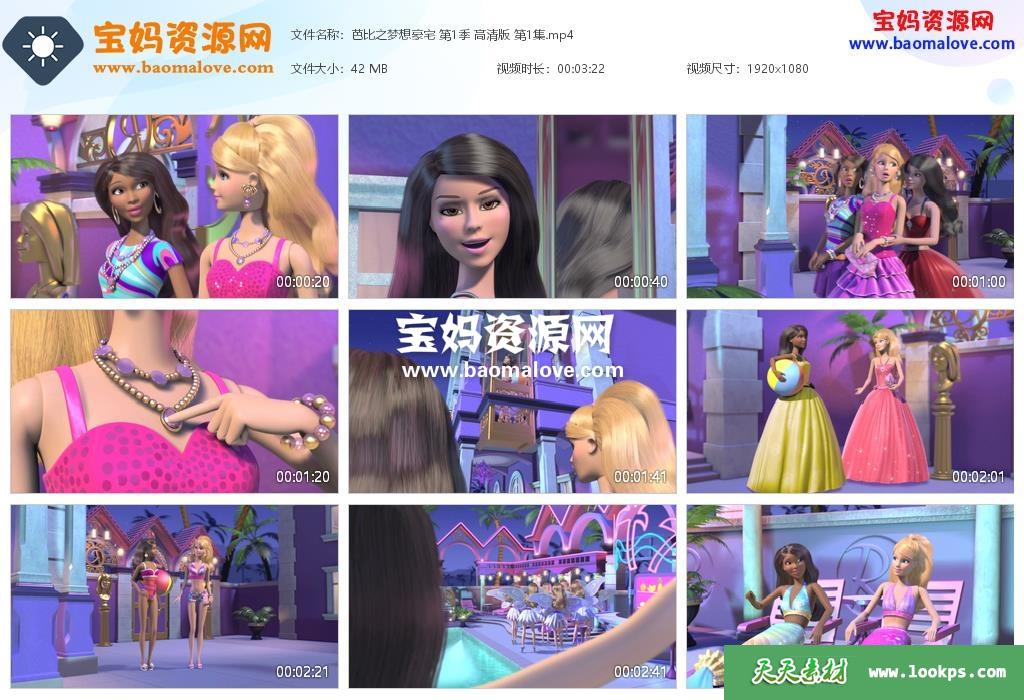 天天资源网收录的动画片《芭比之梦想豪宅》Barbie: Life In the Dreamhouse中文版 第一季,全部14集,国语发音,无字幕;每集大小约40M,资源总大小536M,单集播放时长约4分钟,1080P高清MP4格式,可以在电视机或电脑、平板、IPAD、早教机、手机等各种设备播放,提供百度云网盘下载。