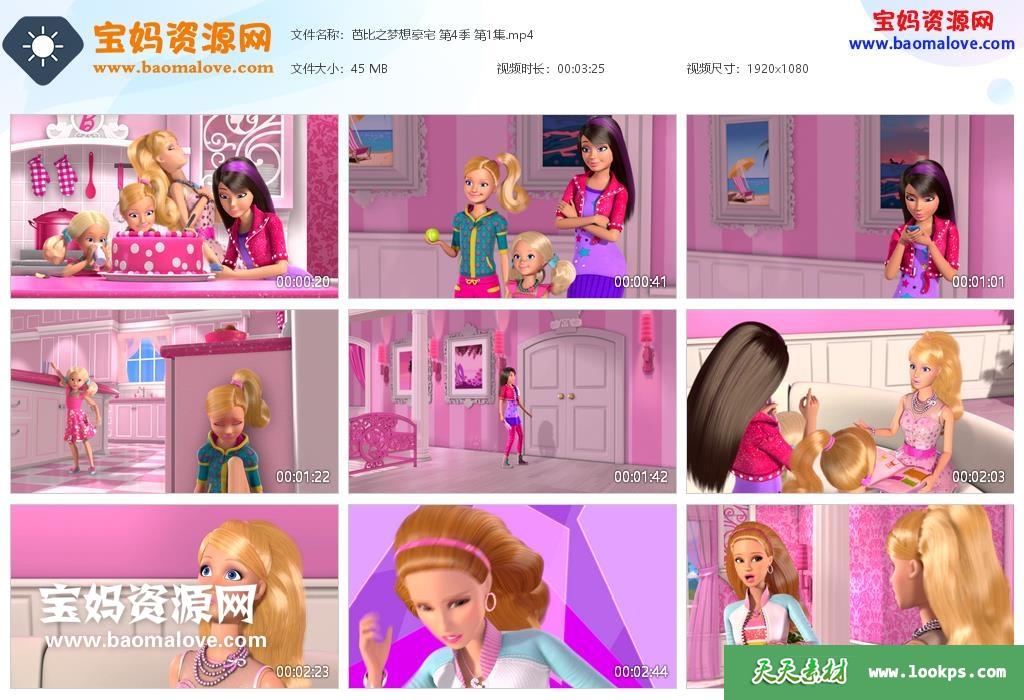 天天资源网收录的动画片《芭比之梦想豪宅》Barbie: Life In the Dreamhouse中文版 第四季,全部9集,国语发音,无字幕;每集大小约45M,资源总大小392M,单集播放时长约3分钟,1080P高清MP4格式,可以在电视机或电脑、平板、IPAD、早教机、手机等各种设备播放,提供百度云网盘下载。